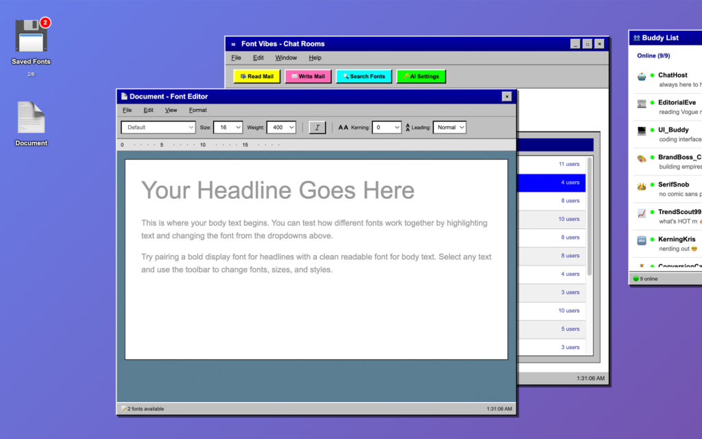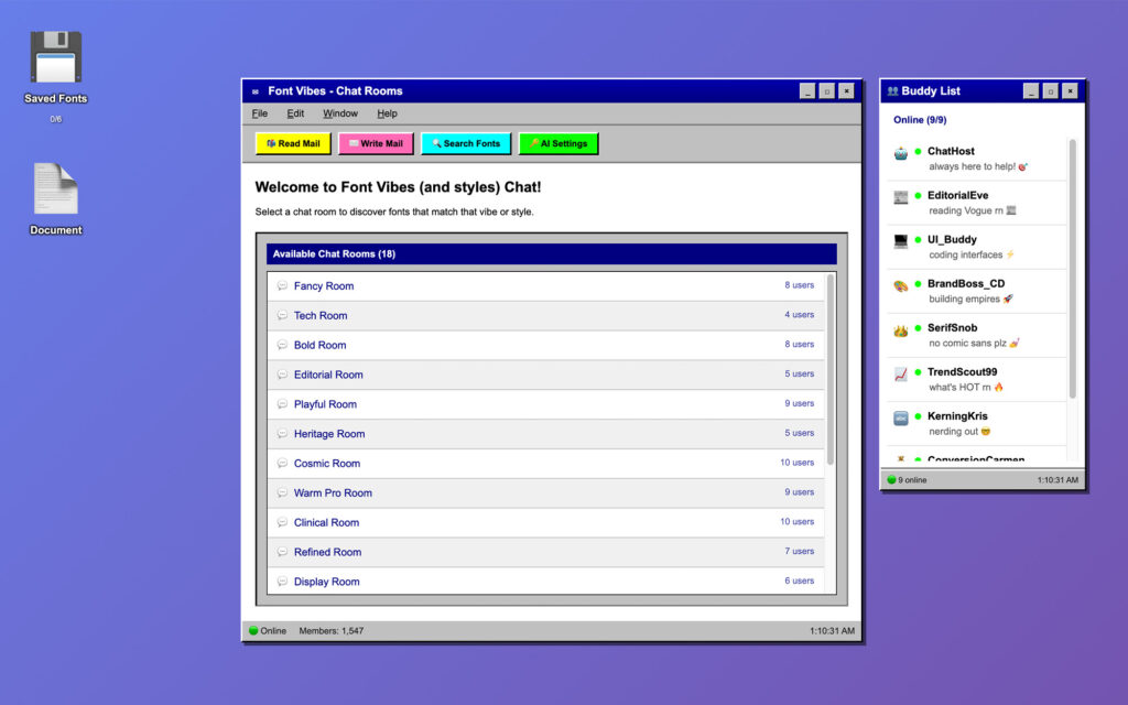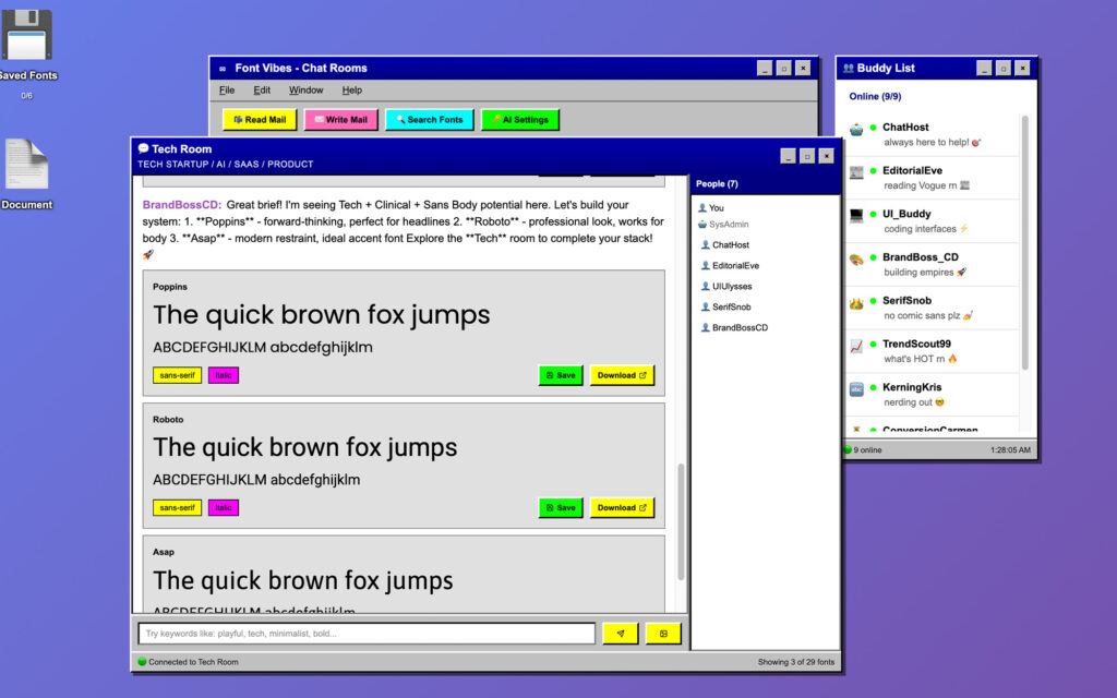 The Buddy List. A persistent AOL-style buddy list shows which bot characters are online. ChatHost (your font guide), EditorialEve (reading Vogue), UI_Buddy (coding interfaces), BrandBoss_CD (building empires), SerifSnob (no comic sans plz), TrendScout99, KerningKris. Each has a personality and a specialty. You can DM them for one-on-one font recommendations.