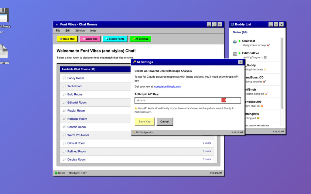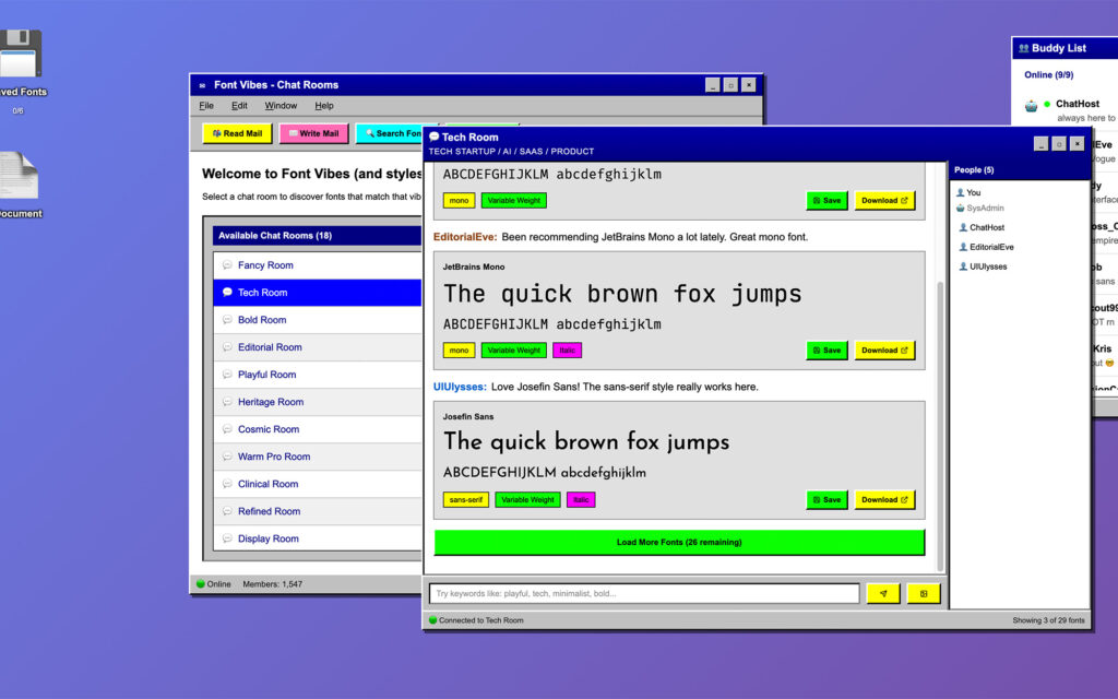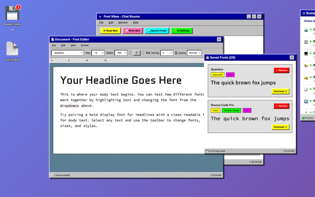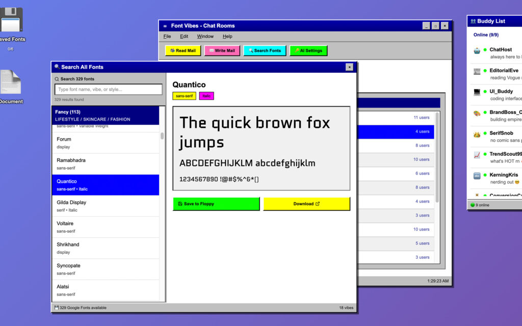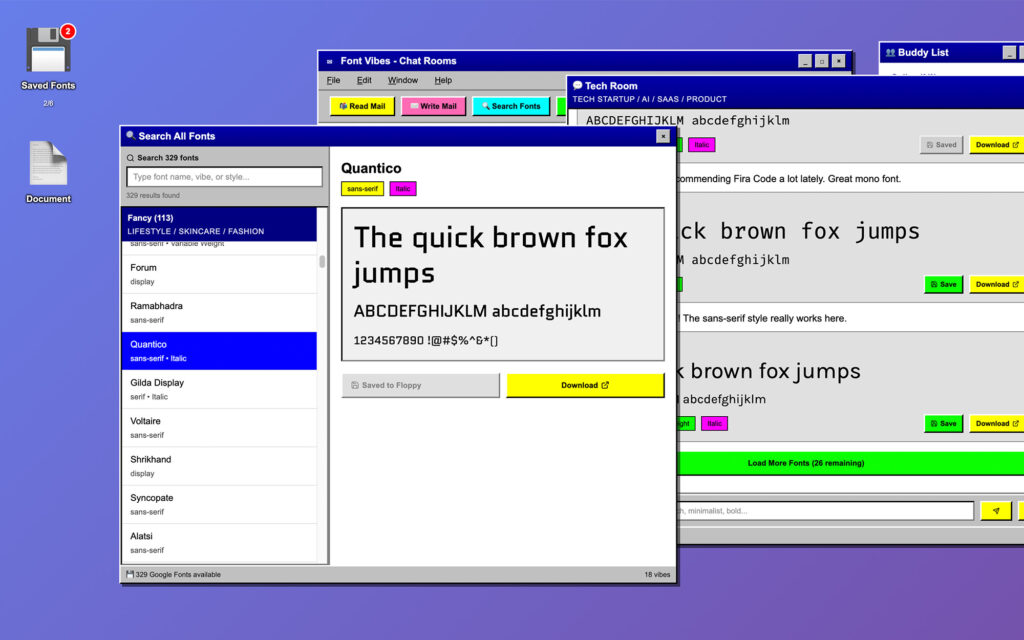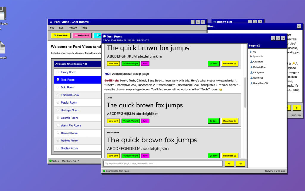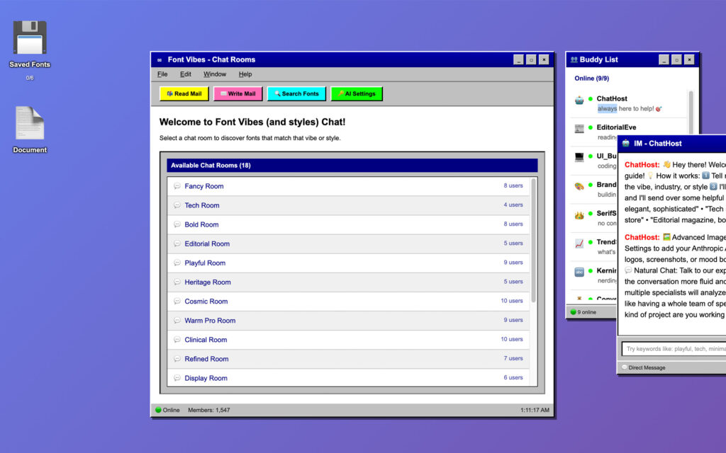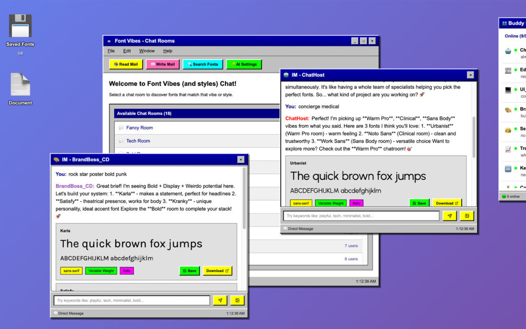 Font Vibes is a fully interactive AOL-inspired desktop where font discovery happens through vibe-based chat rooms, AI-powered bot consultants, and a built-in testing environment.
