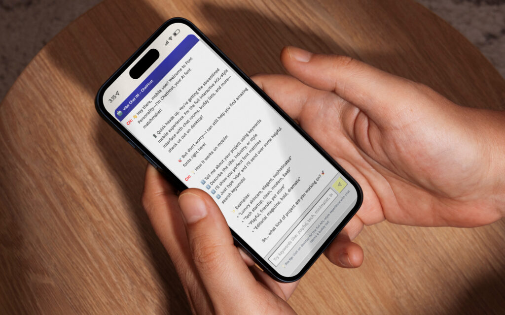 Mobile. On smaller screens, the experience gracefully degrades to a streamlined chat interface. You still get ChatHost, keyword-based font discovery, and the core recommendation flow. A pro tip at the bottom nudges you toward the desktop for the full AOL experience.