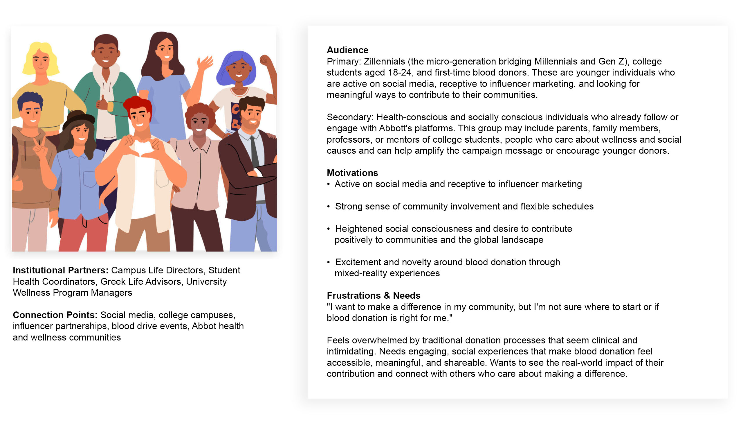 Launch a dynamic 2nd and third quarter campaign that connects with Zillennials and extends Abbott’s brand reach. Partner with social media influencer Dr. Mike to tap into his established audience and amplify The Blood Centers of America’s message. At the same time inspire Abbott’s corporate crowd to join the movement and support Zillennials in their quest for positive change. Also while promoting pilot programs in select cities where donors can experience mixed-reality through Microsoft’s HoloLens2 headset. This immerseve, cutting-edge approach is meant to create buzz, attracting new donors, and solidifying Abbott’s position as an innovative brand that appeals to diverse audiences.
