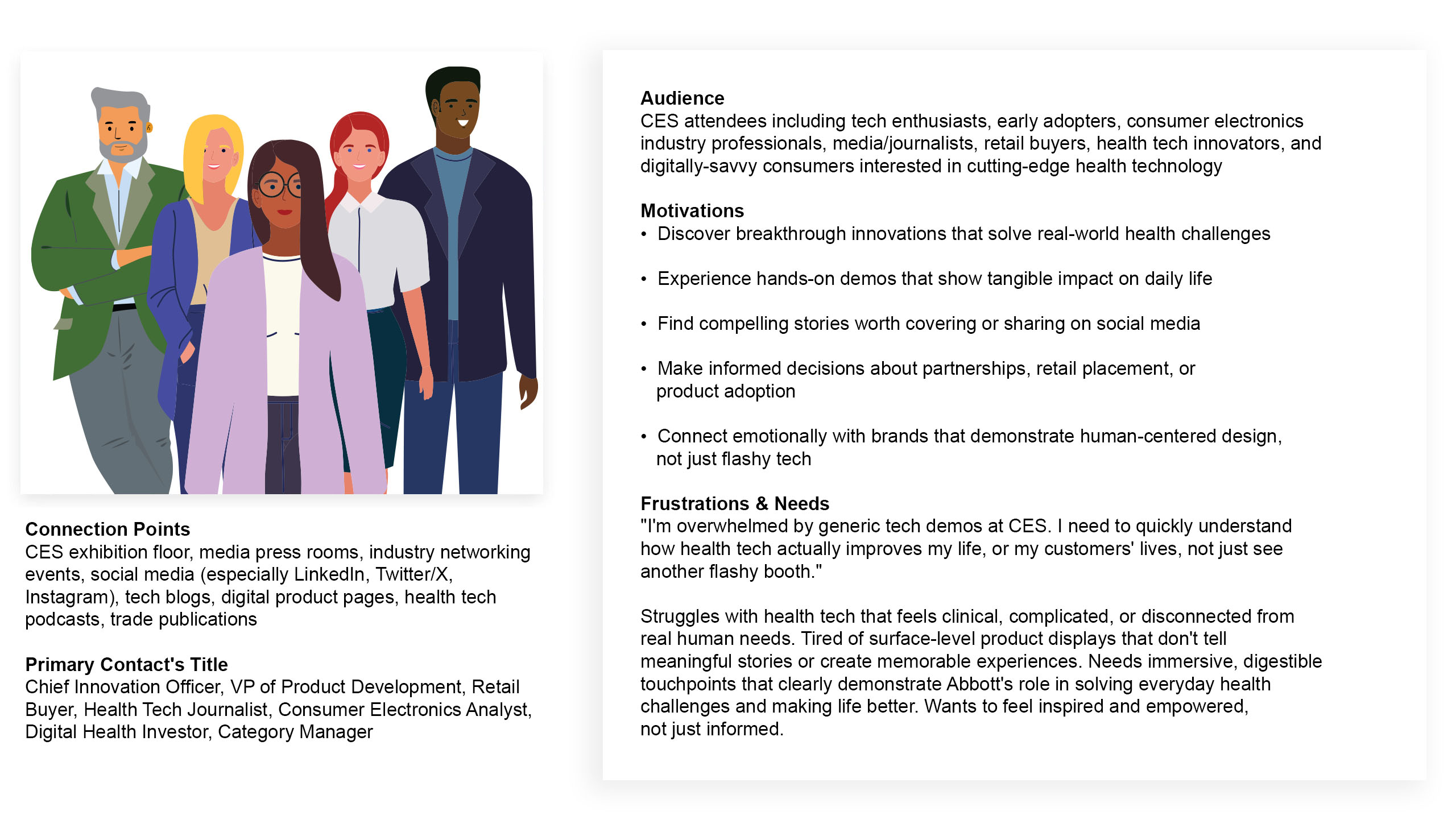 Strategic Direction: Brainstorming sessions directly informed Abbott’s CES 2023 strategy, leading to Mixed Reality activation concept that became centerpiece of booth experience. Generated foundational approach for integrating consumer health narratives with B2B tech showcases, establishing framework adopted across future trade show activations.