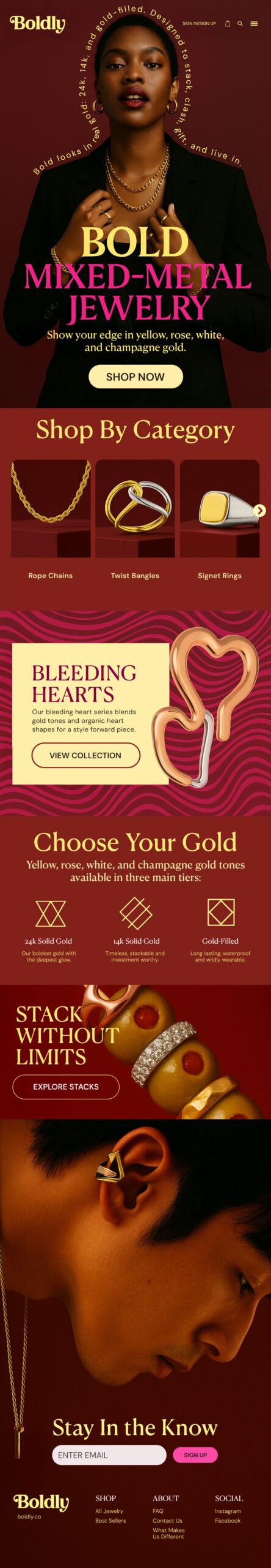 Boldly’s collection includes both high-end fine jewelry and the same styles offered in 14K to 24K gold-filled versions—never gold-plated. The assortment spans yellow, rose, white, and champagne gold, embracing the full spectrum of modern luxury. The brand needed to communicate that style shouldn’t be gated by price tags—it should be worn, stacked, and styled without limits.