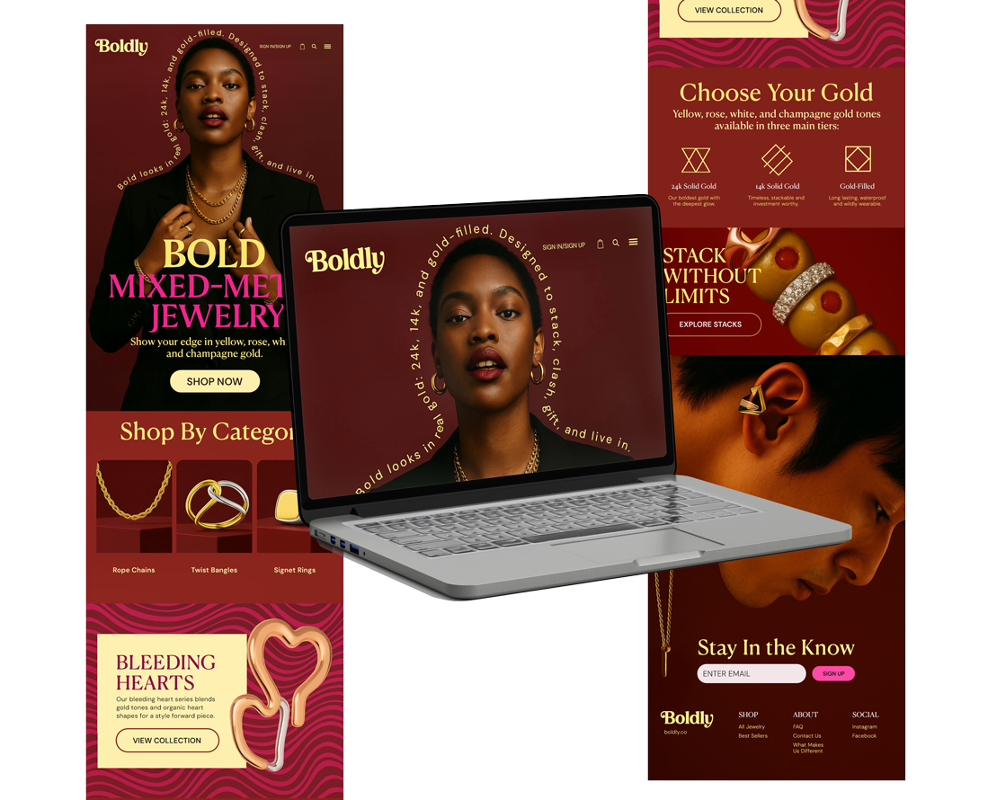 From the jump, I wanted this brand to break rules: visually, tonally, and emotionally. Boldly doesn’t whisper luxury; it makes eye contact and winks. I shaped a visual system rooted in contrast: punchy magentas and golds, sharp editorial typography softened with drippy textures, and layered gradients that feel as fluid as the jewelry itself.